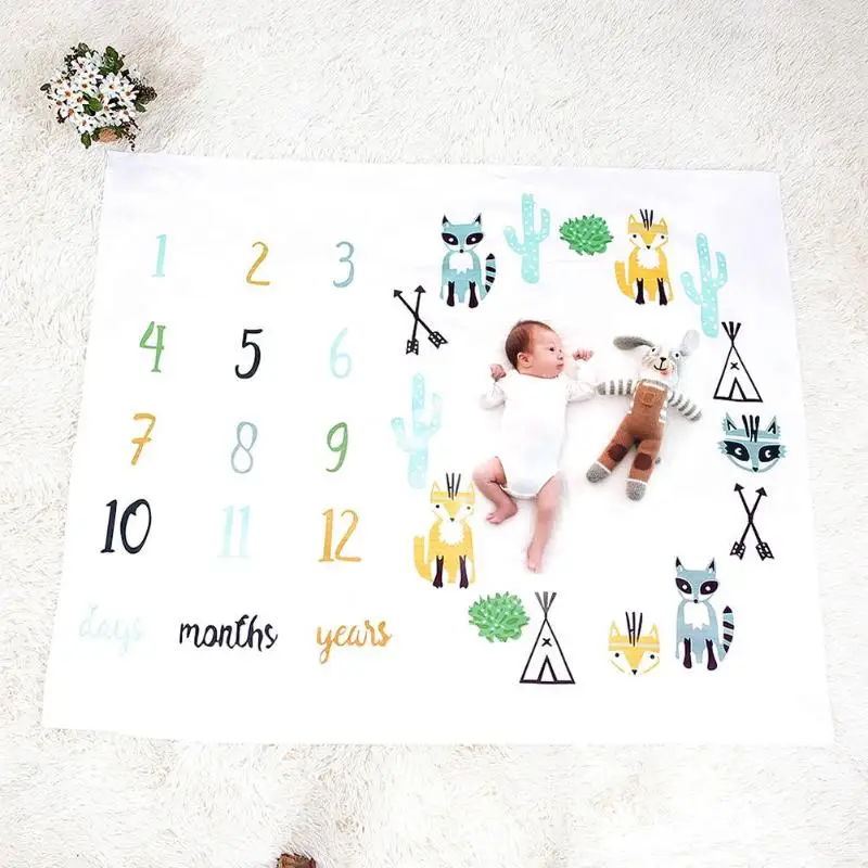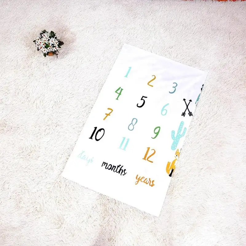 Picture of Cute Baby Blankets Soft Warm Fox Printed Toddlers Swaddle Wrap Monthly Growth Number Newborn Photo Background Infant Bath Towel :